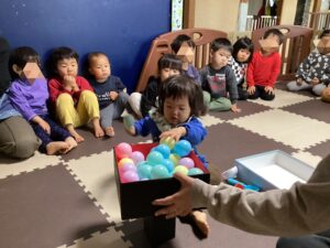 ボールが転がりそうになると手でおさえたり、カラーボールがおたまのサイズと一緒でなかなか落ちてこなかったり、ボールを落とさないようにゆっくり移動したりと、子どもたちの真剣な姿と、出来た時の達成感で楽しそうに過ごしていました。